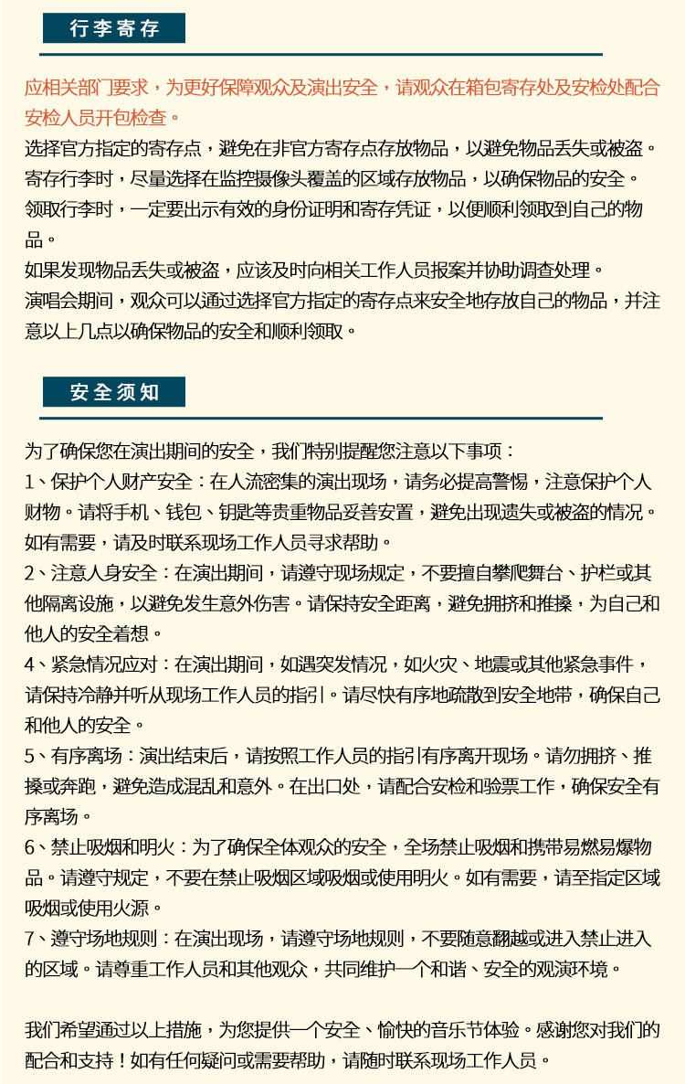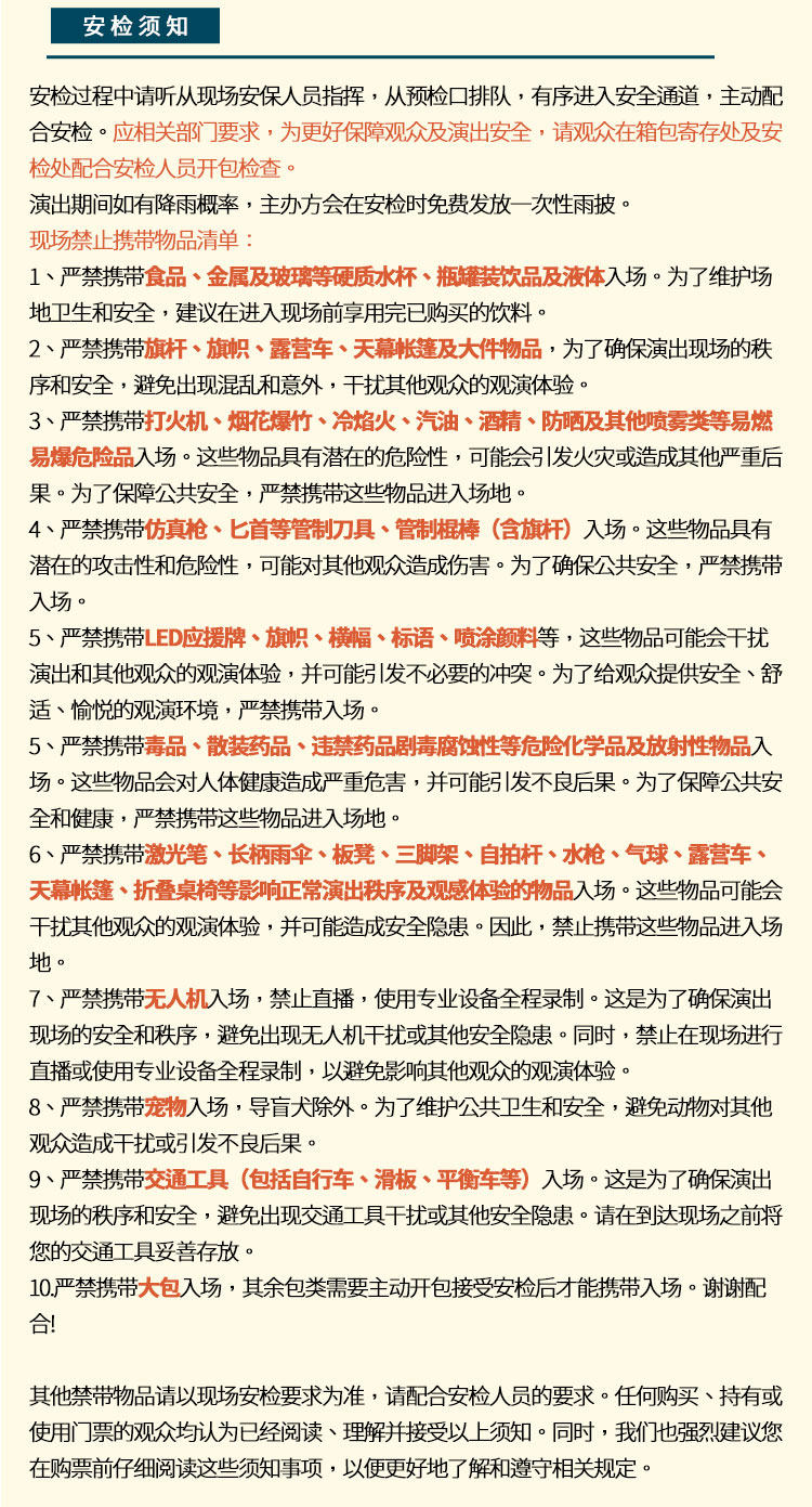 1.演出票品为特殊商品,除不可抗力因素导致演出取消外,订单不支持退换,可在平台转售; 2.演出详情仅供参考,具体以主办方公布信息及现场为准,请准时到场以免错过演出; 3.有票官方确保售出票品真实有效,请放心购买; 4.根据演出火爆情况,有票平台可能会将您所选的快递送票、上门自取等取票方式调整为现场取票,敬请谅解; 5.平台会尽力促使卖家履行交易协议,如果卖家付票过程中发生问题,本平台可协调相同或更高票挡的票品代替,否则平台将全额退款并按订单上约定的赔付方式与金额向用户进行赔付; 6.为了安全起见需要本人签收,演出快递票均为快递费到付(不包邮),请知晓!