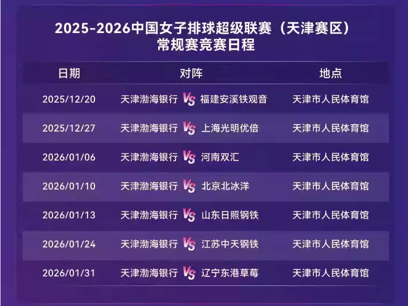 首页 > 体育赛事 > 2025-2026中国排球超级联赛天津渤海排球俱乐部主场赛事