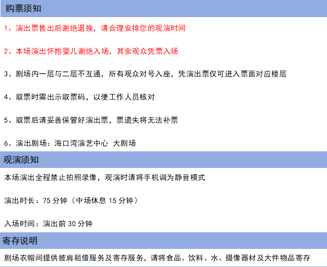 1.演出票品为特殊商品,除不可抗力因素导致演出取消外,订单不支持退换,可在平台转售; 2.演出详情仅供参考,具体以主办方公布信息及现场为准,请准时到场以免错过演出; 3.有票官方确保售出票品真实有效,请放心购买; 4.根据演出火爆情况,有票平台可能会将您所选的快递送票、上门自取等取票方式调整为现场取票,敬请谅解; 5.平台会尽力促使卖家履行交易协议,如果卖家付票过程中发生问题,本平台可协调相同或更高票挡的票品代替,否则平台将全额退款并按订单上约定的赔付方式与金额向用户进行赔付; 6.为了安全起见需要本人签收,演出快递票均为快递费到付(不包邮),请知晓!