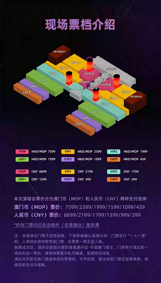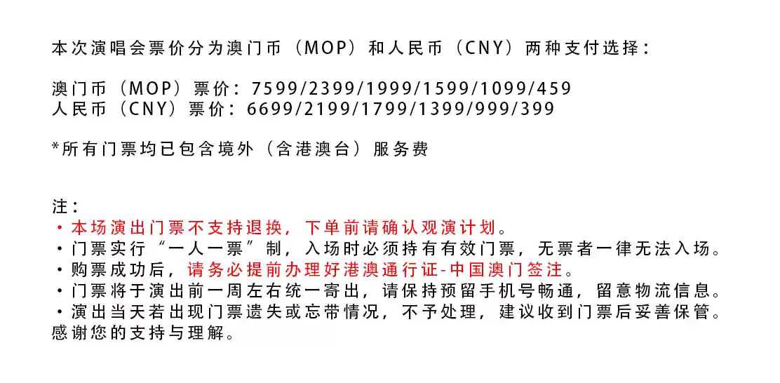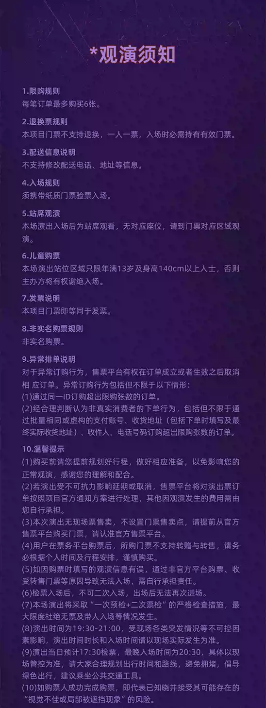 1.演出票品为特殊商品,除不可抗力因素导致演出取消外,订单不支持退换,可在平台转售; 2.演出详情仅供参考,具体以主办方公布信息及现场为准,请准时到场以免错过演出; 3.有票官方确保售出票品真实有效,请放心购买; 4.根据演出火爆情况,有票平台可能会将您所选的快递送票、上门自取等取票方式调整为现场取票,敬请谅解; 5.平台会尽力促使卖家履行交易协议,如果卖家付票过程中发生问题,本平台可协调相同或更高票挡的票品代替,否则平台将全额退款并按订单上约定的赔付方式与金额向用户进行赔付; 6.为了安全起见需要本人签收,演出快递票均为快递费到付(不包邮),请知晓!