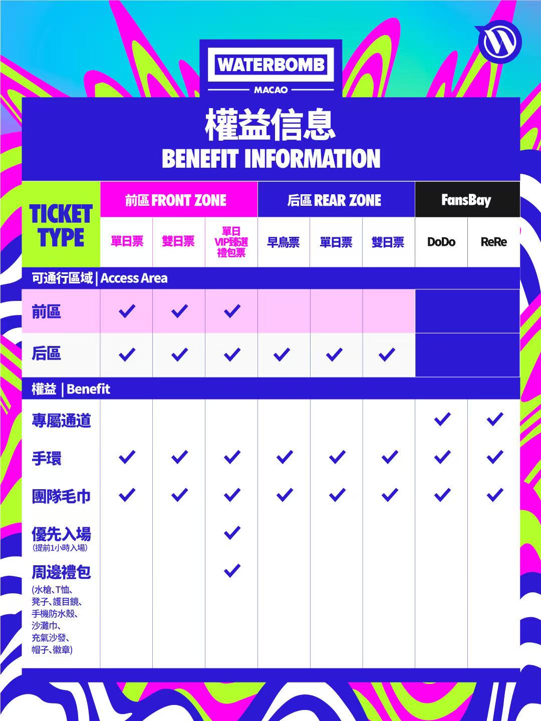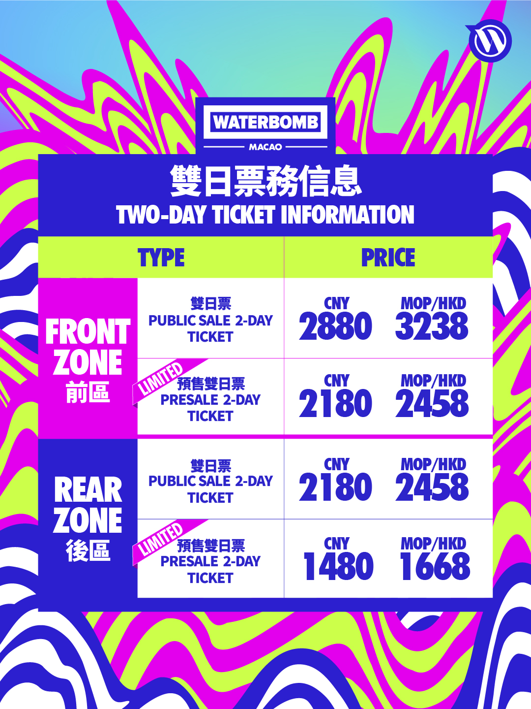 双日票(前区)CNY 2880(MOP /HKD 3238)