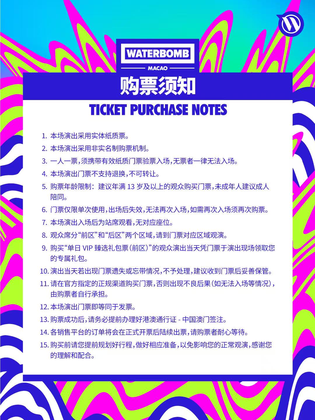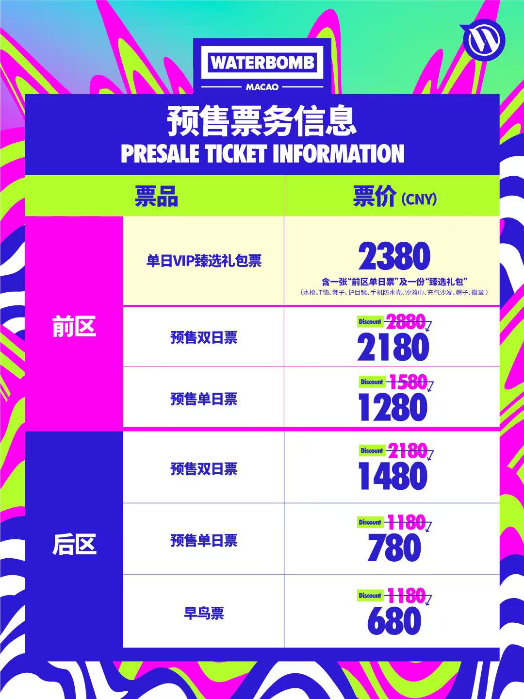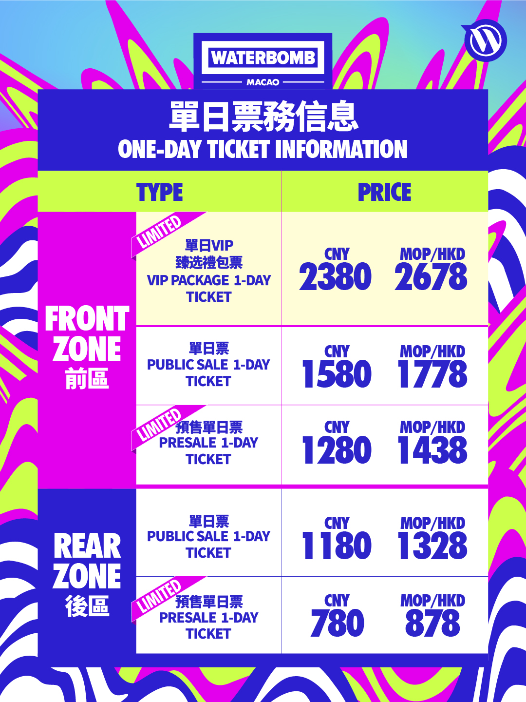 单日票(前区) CNY 1580(MOP /HKD 1778)