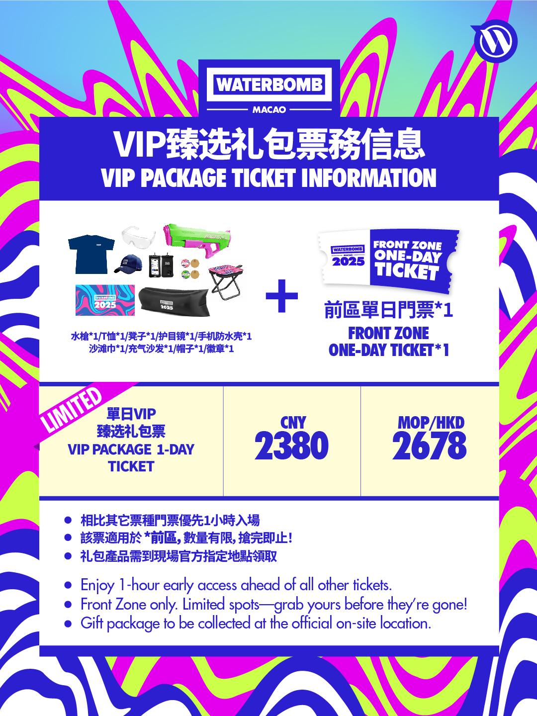 单日VIP臻选礼包票(前区) CNY 2380(MOP /HKD 2678)