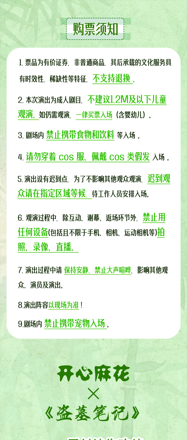 1.演出票品为特殊商品,除不可抗力因素导致演出取消外,订单不支持退换,可在平台转售; 2.演出详情仅供参考,具体以主办方公布信息及现场为准,请准时到场以免错过演出; 3.有票官方确保售出票品真实有效,请放心购买; 4.根据演出火爆情况,有票平台可能会将您所选的快递送票、上门自取等取票方式调整为现场取票,敬请谅解; 5.平台会尽力促使卖家履行交易协议,如果卖家付票过程中发生问题,本平台可协调相同或更高票挡的票品代替,否则平台将全额退款并按订单上约定的赔付方式与金额向用户进行赔付; 6.为了安全起见需要本人签收,演出快递票均为快递费到付(不包邮),请知晓!