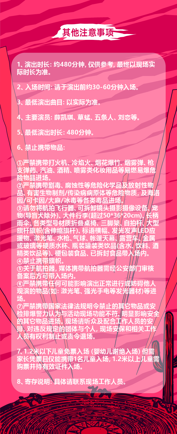1.演出票品为特殊商品,除不可抗力因素导致演出取消外,订单不支持退换,可在平台转售; 2.演出详情仅供参考,具体以主办方公布信息及现场为准,请准时到场以免错过演出; 3.有票官方确保售出票品真实有效,请放心购买; 4.根据演出火爆情况,有票平台可能会将您所选的快递送票、上门自取等取票方式调整为现场取票,敬请谅解; 5.平台会尽力促使卖家履行交易协议,如果卖家付票过程中发生问题,本平台可协调相同或更高票挡的票品代替,否则平台将全额退款并按订单上约定的赔付方式与金额向用户进行赔付; 6.为了安全起见需要本人签收,演出快递票均为快递费到付(不包邮),请知晓!