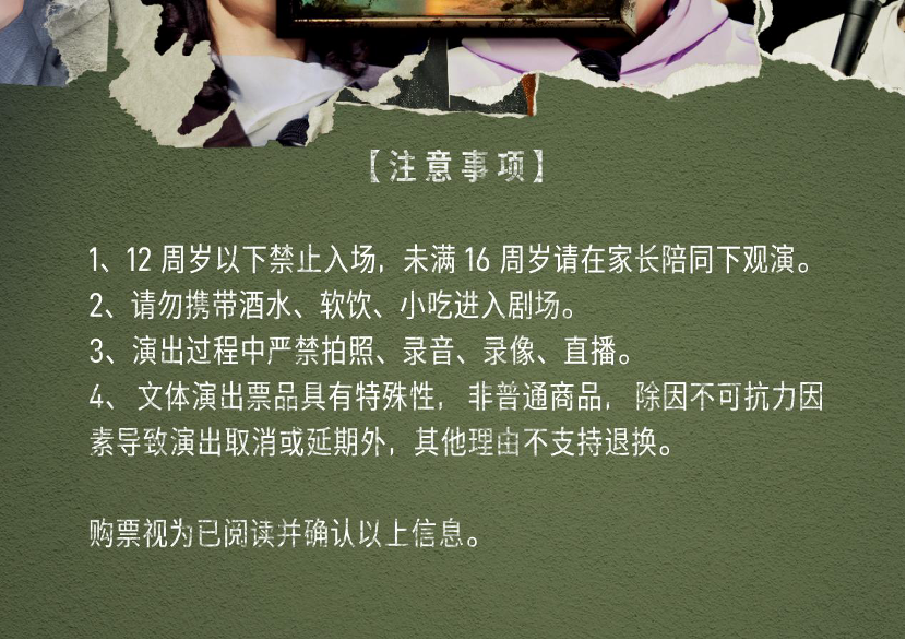 1.演出票品为特殊商品,除不可抗力因素导致演出取消外,订单不支持退换,可在平台转售; 2.演出详情仅供参考,具体以主办方公布信息及现场为准,请准时到场以免错过演出; 3.有票官方确保售出票品真实有效,请放心购买; 4.根据演出火爆情况,有票平台可能会将您所选的快递送票、上门自取等取票方式调整为现场取票,敬请谅解; 5.平台会尽力促使卖家履行交易协议,如果卖家付票过程中发生问题,本平台可协调相同或更高票挡的票品代替,否则平台将全额退款并按订单上约定的赔付方式与金额向用户进行赔付; 6.为了安全起见需要本人签收,演出快递票均为快递费到付(不包邮),请知晓!