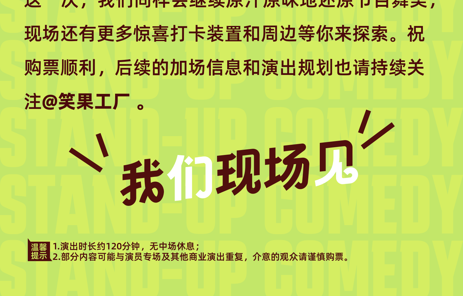 1.演出票品为特殊商品,除不可抗力因素导致演出取消外,订单不支持退换,可在平台转售; 2.演出详情仅供参考,具体以主办方公布信息及现场为准,请准时到场以免错过演出; 3.有票官方确保售出票品真实有效,请放心购买; 4.根据演出火爆情况,有票平台可能会将您所选的快递送票、上门自取等取票方式调整为现场取票,敬请谅解; 5.平台会尽力促使卖家履行交易协议,如果卖家付票过程中发生问题,本平台可协调相同或更高票挡的票品代替,否则平台将全额退款并按订单上约定的赔付方式与金额向用户进行赔付; 6.为了安全起见需要本人签收,演出快递票均为快递费到付(不包邮),请知晓!