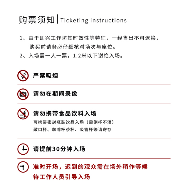 1.演出票品为特殊商品,除不可抗力因素导致演出取消外,订单不支持退换,可在平台转售; 2.演出详情仅供参考,具体以主办方公布信息及现场为准,请准时到场以免错过演出; 3.有票官方确保售出票品真实有效,请放心购买; 4.根据演出火爆情况,有票平台可能会将您所选的快递送票、上门自取等取票方式调整为现场取票,敬请谅解; 5.平台会尽力促使卖家履行交易协议,如果卖家付票过程中发生问题,本平台可协调相同或更高票挡的票品代替,否则平台将全额退款并按订单上约定的赔付方式与金额向用户进行赔付; 6.为了安全起见需要本人签收,演出快递票均为快递费到付(不包邮),请知晓!