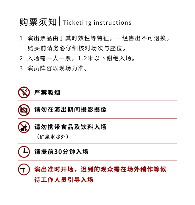 1.演出票品为特殊商品,除不可抗力因素导致演出取消外,订单不支持退换,可在平台转售; 2.演出详情仅供参考,具体以主办方公布信息及现场为准,请准时到场以免错过演出; 3.有票官方确保售出票品真实有效,请放心购买; 4.根据演出火爆情况,有票平台可能会将您所选的快递送票、上门自取等取票方式调整为现场取票,敬请谅解; 5.平台会尽力促使卖家履行交易协议,如果卖家付票过程中发生问题,本平台可协调相同或更高票挡的票品代替,否则平台将全额退款并按订单上约定的赔付方式与金额向用户进行赔付; 6.为了安全起见需要本人签收,演出快递票均为快递费到付(不包邮),请知晓!