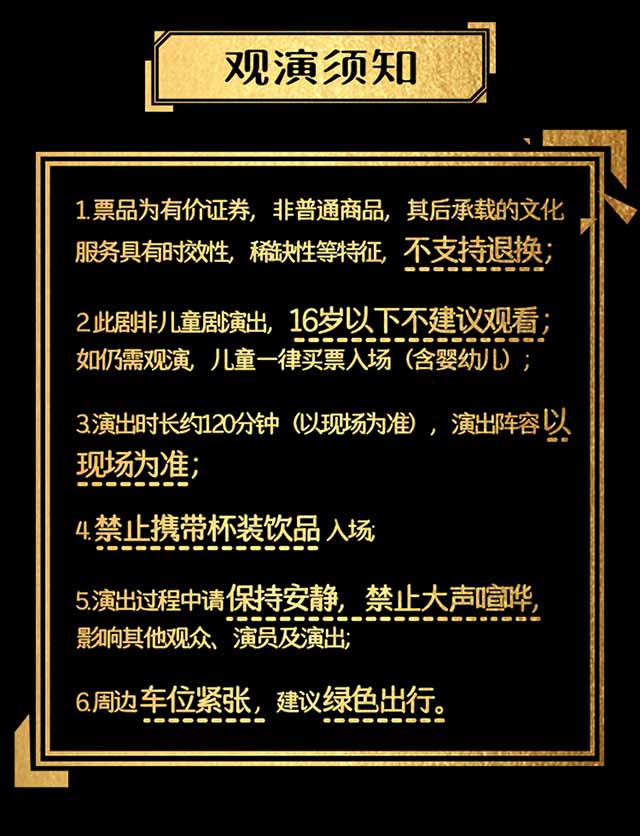 1.演出票品为特殊商品,除不可抗力因素导致演出取消外,订单不支持退换,可在平台转售; 2.演出详情仅供参考,具体以主办方公布信息及现场为准,请准时到场以免错过演出; 3.有票官方确保售出票品真实有效,请放心购买; 4.根据演出火爆情况,有票平台可能会将您所选的快递送票、上门自取等取票方式调整为现场取票,敬请谅解; 5.平台会尽力促使卖家履行交易协议,如果卖家付票过程中发生问题,本平台可协调相同或更高票挡的票品代替,否则平台将全额退款并按订单上约定的赔付方式与金额向用户进行赔付; 6.为了安全起见需要本人签收,演出快递票均为快递费到付(不包邮),请知晓!