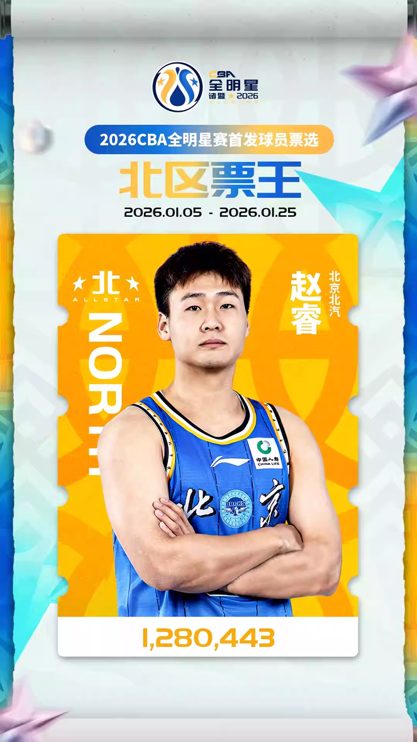 北区首发阵容:赵睿 、曾凡博、齐麟、付豪、廖三宁,赵睿以1280443票当选北区票王。