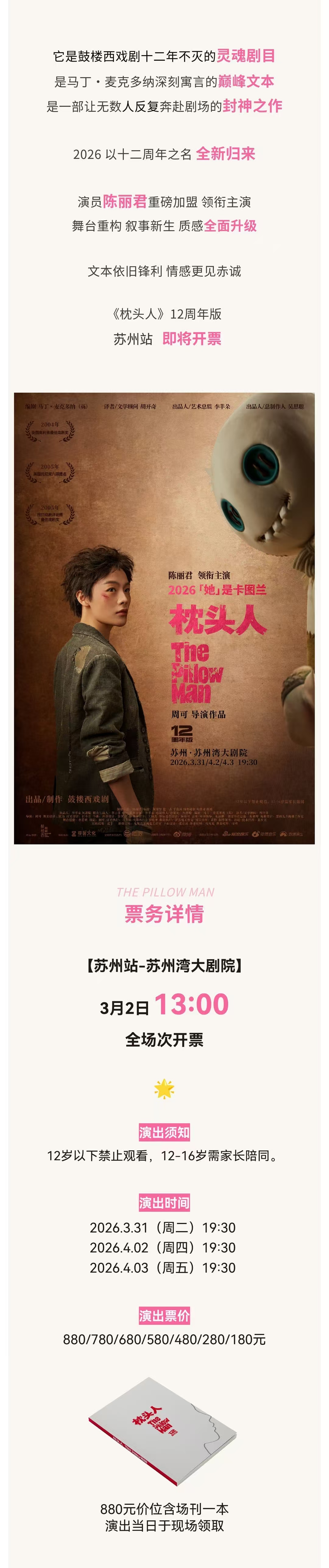 1.演出票品为特殊商品,除不可抗力因素导致演出取消外,订单不支持退换,可在平台转售; 2.演出详情仅供参考,具体以主办方公布信息及现场为准,请准时到场以免错过演出; 3.有票官方确保售出票品真实有效,请放心购买; 4.根据演出火爆情况,有票平台可能会将您所选的快递送票、上门自取等取票方式调整为现场取票,敬请谅解; 5.平台会尽力促使卖家履行交易协议,如果卖家付票过程中发生问题,本平台可协调相同或更高票挡的票品代替,否则平台将全额退款并按订单上约定的赔付方式与金额向用户进行赔付; 6.为了安全起见需要本人签收,演出快递票均为快递费到付(不包邮),请知晓!