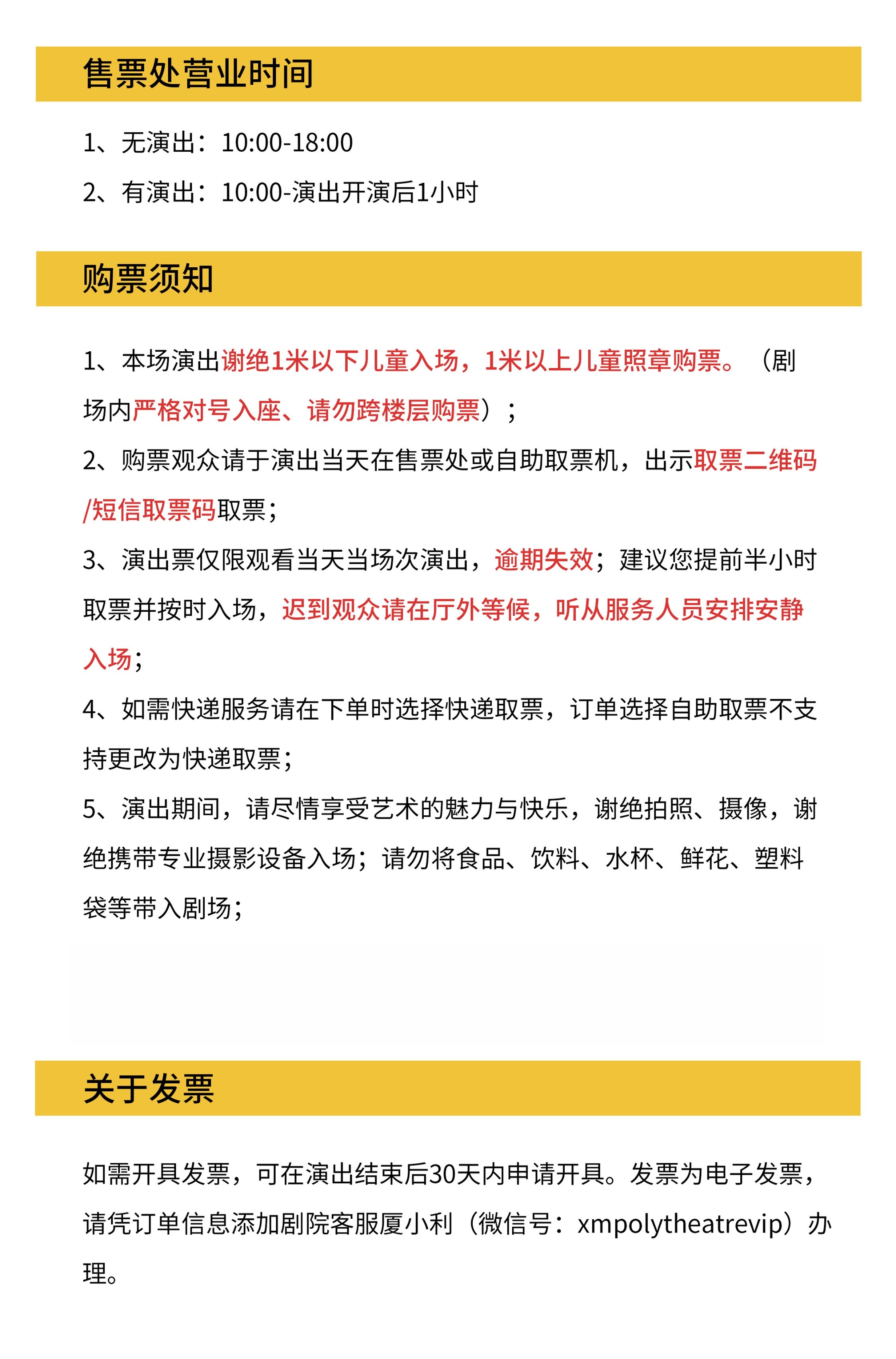 1.演出票品为特殊商品,除不可抗力因素导致演出取消外,订单不支持退换,可在平台转售; 2.演出详情仅供参考,具体以主办方公布信息及现场为准,请准时到场以免错过演出; 3.有票官方确保售出票品真实有效,请放心购买; 4.根据演出火爆情况,有票平台可能会将您所选的快递送票、上门自取等取票方式调整为现场取票,敬请谅解; 5.平台会尽力促使卖家履行交易协议,如果卖家付票过程中发生问题,本平台可协调相同或更高票挡的票品代替,否则平台将全额退款并按订单上约定的赔付方式与金额向用户进行赔付; 6.为了安全起见需要本人签收,演出快递票均为快递费到付(不包邮),请知晓!