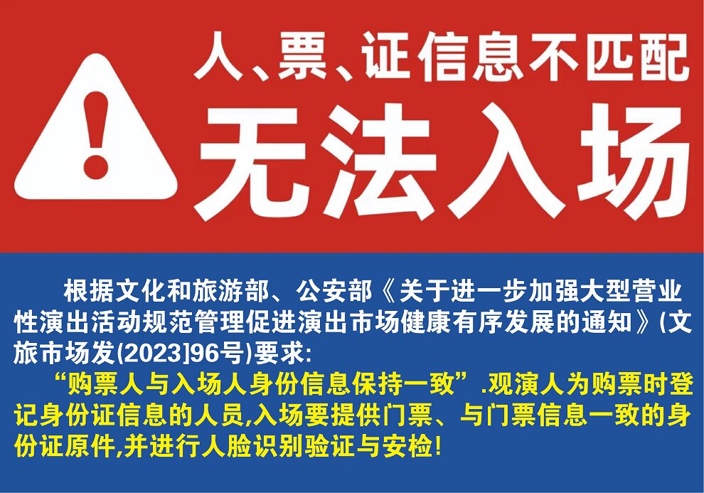 1.演出票品为特殊商品,除不可抗力因素导致演出取消外,订单不支持退换,可在平台转售; 2.演出详情仅供参考,具体以主办方公布信息及现场为准,请准时到场以免错过演出; 3.有票官方确保售出票品真实有效,请放心购买; 4.根据演出火爆情况,有票平台可能会将您所选的快递送票、上门自取等取票方式调整为现场取票,敬请谅解; 5.平台会尽力促使卖家履行交易协议,如果卖家付票过程中发生问题,本平台可协调相同或更高票挡的票品代替,否则平台将全额退款并按订单上约定的赔付方式与金额向用户进行赔付; 6.为了安全起见需要本人签收,演出快递票均为快递费到付(不包邮),请知晓!