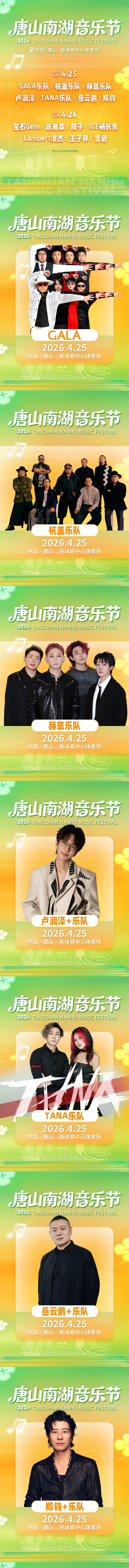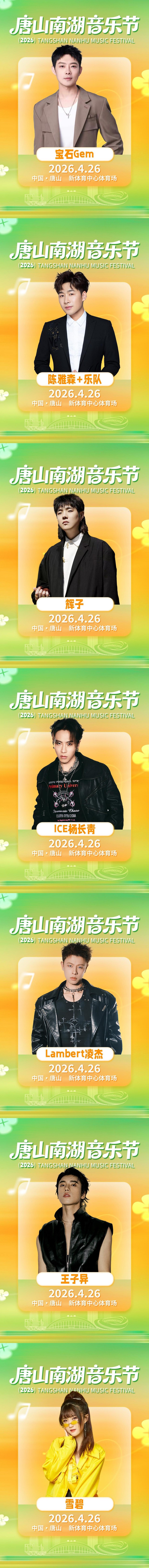 唐山南湖音乐节,一次迎接春天抵达的欢迎派对,一场为同频者而生的温度聚会。2026年4月25日至26日,唐山新体育中心体育场,14组精彩舞台轮番上演。郑钧、岳云鹏、宝石Gem、GALA乐队、杭盖乐队、王子异、辉子、ICE杨长青、TANA乐队、Lambert凌杰、卢润泽、赫兹乐队、雪碧、陈雅森华语乐坛顶级音乐人们与你将共同见证凤凰之城真正意义上的音乐节现场,在超600分钟的律动里,我们诚邀您一起感受藏在这座百年工业名城深处的炽热。