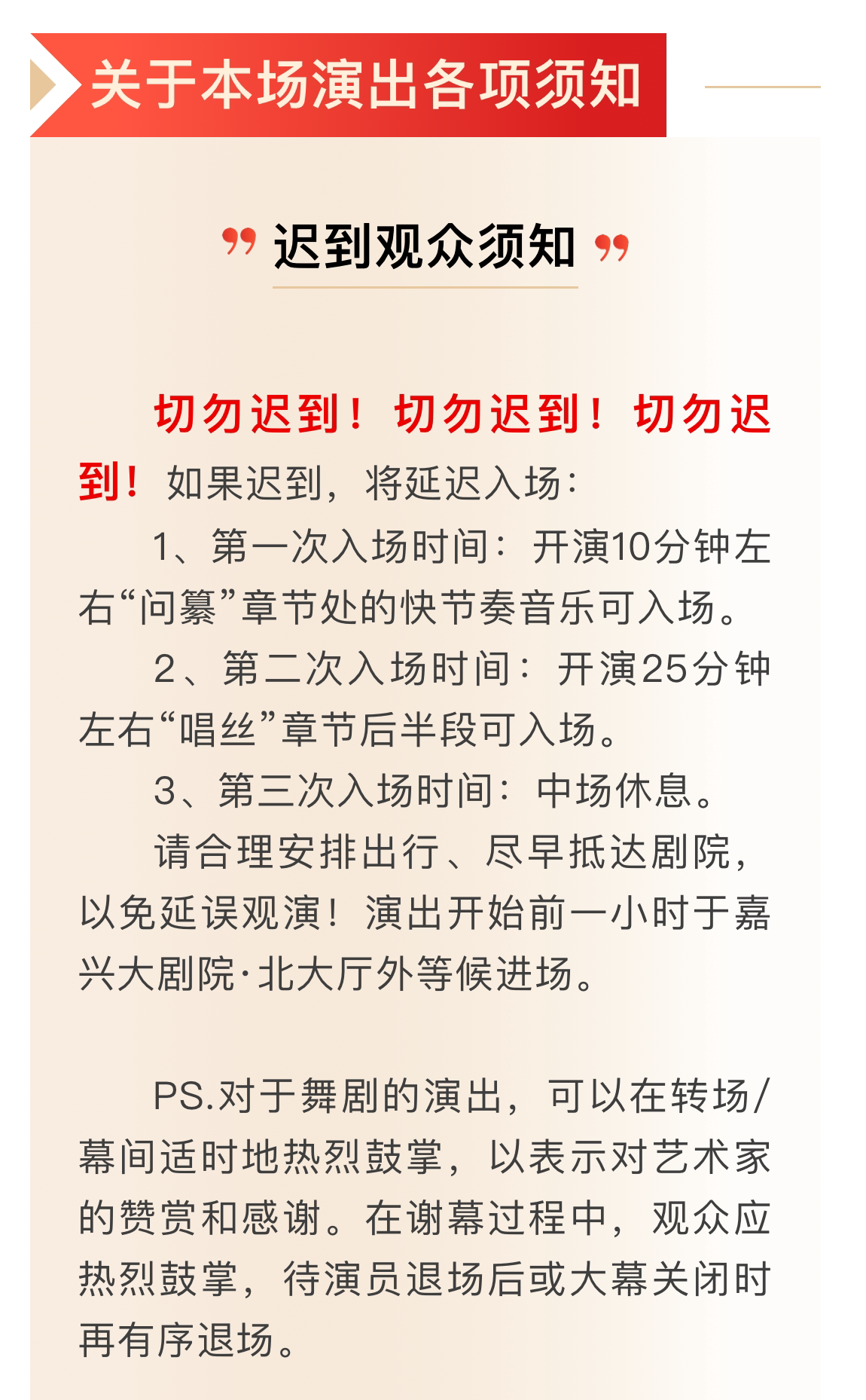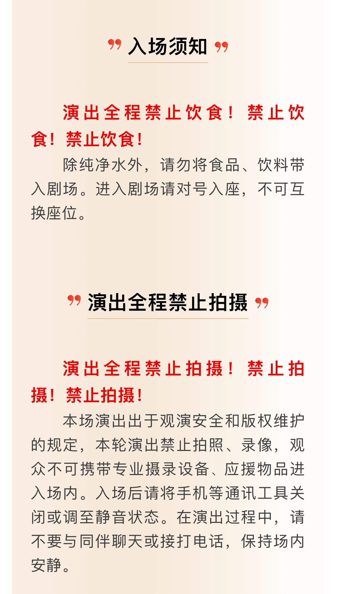 1.演出票品为特殊商品,除不可抗力因素导致演出取消外,订单不支持退换,可在平台转售; 2.演出详情仅供参考,具体以主办方公布信息及现场为准,请准时到场以免错过演出; 3.有票官方确保售出票品真实有效,请放心购买; 4.根据演出火爆情况,有票平台可能会将您所选的快递送票、上门自取等取票方式调整为现场取票,敬请谅解; 5.平台会尽力促使卖家履行交易协议,如果卖家付票过程中发生问题,本平台可协调相同或更高票挡的票品代替,否则平台将全额退款并按订单上约定的赔付方式与金额向用户进行赔付; 6.为了安全起见需要本人签收,演出快递票均为快递费到付(不包邮),请知晓!