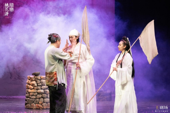 “桃花源”则是一出古装喜剧,以陶渊明的《桃花源》为引,讲述武陵渔夫老陶之妻——春花,与房东袁老板私通,三人心照不宣却难以说出口。一气之下,老陶离家出走,去上游打大鱼,却误入桃花源,在那里,他遇见了和春花、袁老板长得一模一样的白袍男女,他们热情地邀请老陶住下。过了几日,老陶心中仍放不下春花,回到武陵,却发现此地似乎已经过了十几年,春花已与袁老板成家生子,日子却仍是鸡飞狗跳……