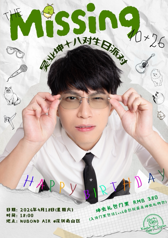 从青涩出道到深耕舞台多年,吴业坤用歌声陪伴无数人走过青春,每一段旋律、每一场相遇,都藏着未说出口的温柔与执念。此次生日会定名 The Missing 10+26,既是对过往音乐旅程的温柔回望,也是对粉丝长久陪伴的暖心回应;而18对生日派对 更是打破常规生辰宴的限定概念,打造专属粉丝的私密狂欢场,把18岁的热烈与当下的成熟融合,用一场充满仪式感的音乐聚会,和所有支持他的人,共度最特别的生日时刻。