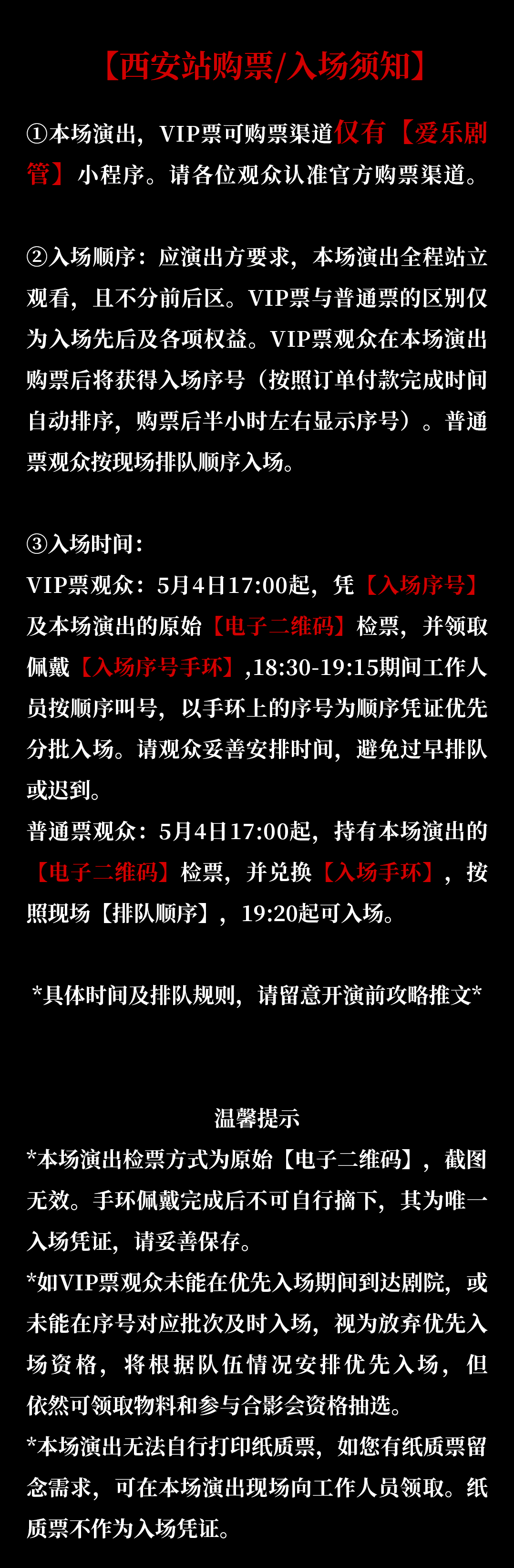 1.演出票品为特殊商品,除不可抗力因素导致演出取消外,订单不支持退换,可在平台转售; 2.演出详情仅供参考,具体以主办方公布信息及现场为准,请准时到场以免错过演出; 3.有票官方确保售出票品真实有效,请放心购买; 4.根据演出火爆情况,有票平台可能会将您所选的快递送票、上门自取等取票方式调整为现场取票,敬请谅解; 5.平台会尽力促使卖家履行交易协议,如果卖家付票过程中发生问题,本平台可协调相同或更高票挡的票品代替,否则平台将全额退款并按订单上约定的赔付方式与金额向用户进行赔付; 6.为了安全起见需要本人签收,演出快递票均为快递费到付(不包邮),请知晓!