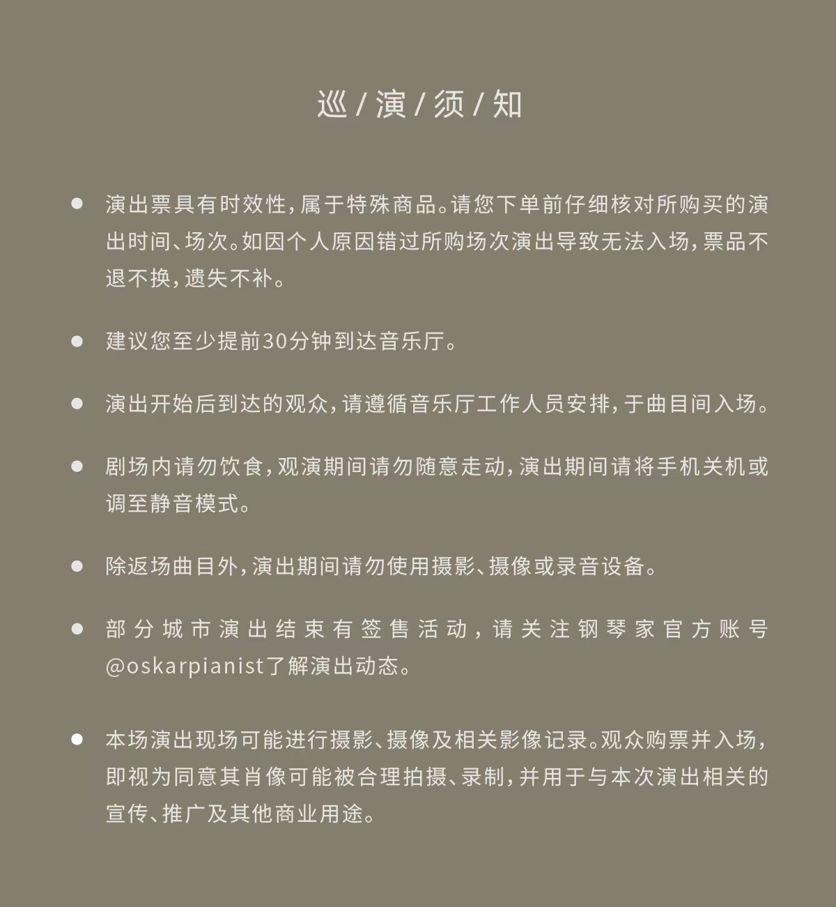 1.演出票品为特殊商品,除不可抗力因素导致演出取消外,订单不支持退换,可在平台转售; 2.演出详情仅供参考,具体以主办方公布信息及现场为准,请准时到场以免错过演出; 3.有票官方确保售出票品真实有效,请放心购买; 4.根据演出火爆情况,有票平台可能会将您所选的快递送票、上门自取等取票方式调整为现场取票,敬请谅解; 5.平台会尽力促使卖家履行交易协议,如果卖家付票过程中发生问题,本平台可协调相同或更高票挡的票品代替,否则平台将全额退款并按订单上约定的赔付方式与金额向用户进行赔付; 6.为了安全起见需要本人签收,演出快递票均为快递费到付(不包邮),请知晓!