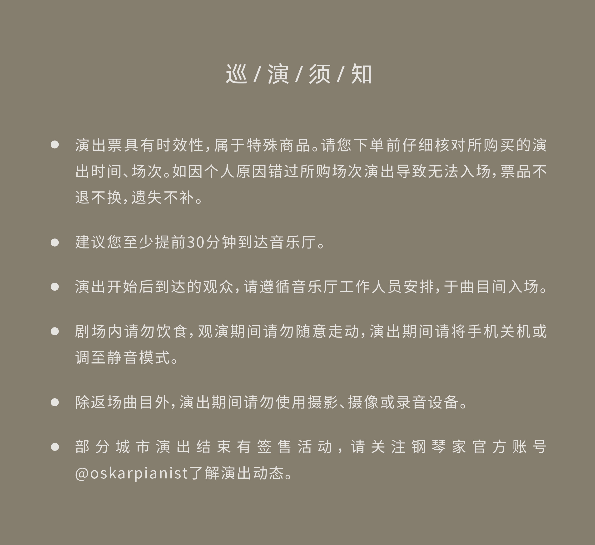 1.演出票品为特殊商品,除不可抗力因素导致演出取消外,订单不支持退换,可在平台转售; 2.演出详情仅供参考,具体以主办方公布信息及现场为准,请准时到场以免错过演出; 3.有票官方确保售出票品真实有效,请放心购买; 4.根据演出火爆情况,有票平台可能会将您所选的快递送票、上门自取等取票方式调整为现场取票,敬请谅解; 5.平台会尽力促使卖家履行交易协议,如果卖家付票过程中发生问题,本平台可协调相同或更高票挡的票品代替,否则平台将全额退款并按订单上约定的赔付方式与金额向用户进行赔付; 6.为了安全起见需要本人签收,演出快递票均为快递费到付(不包邮),请知晓!