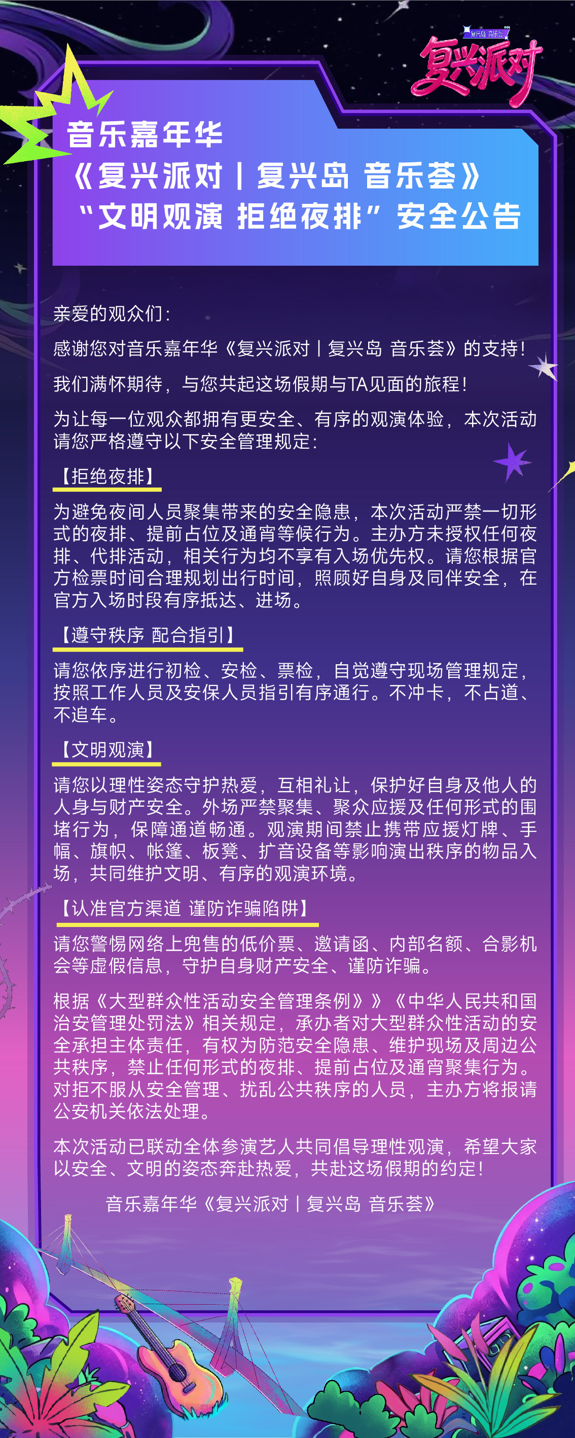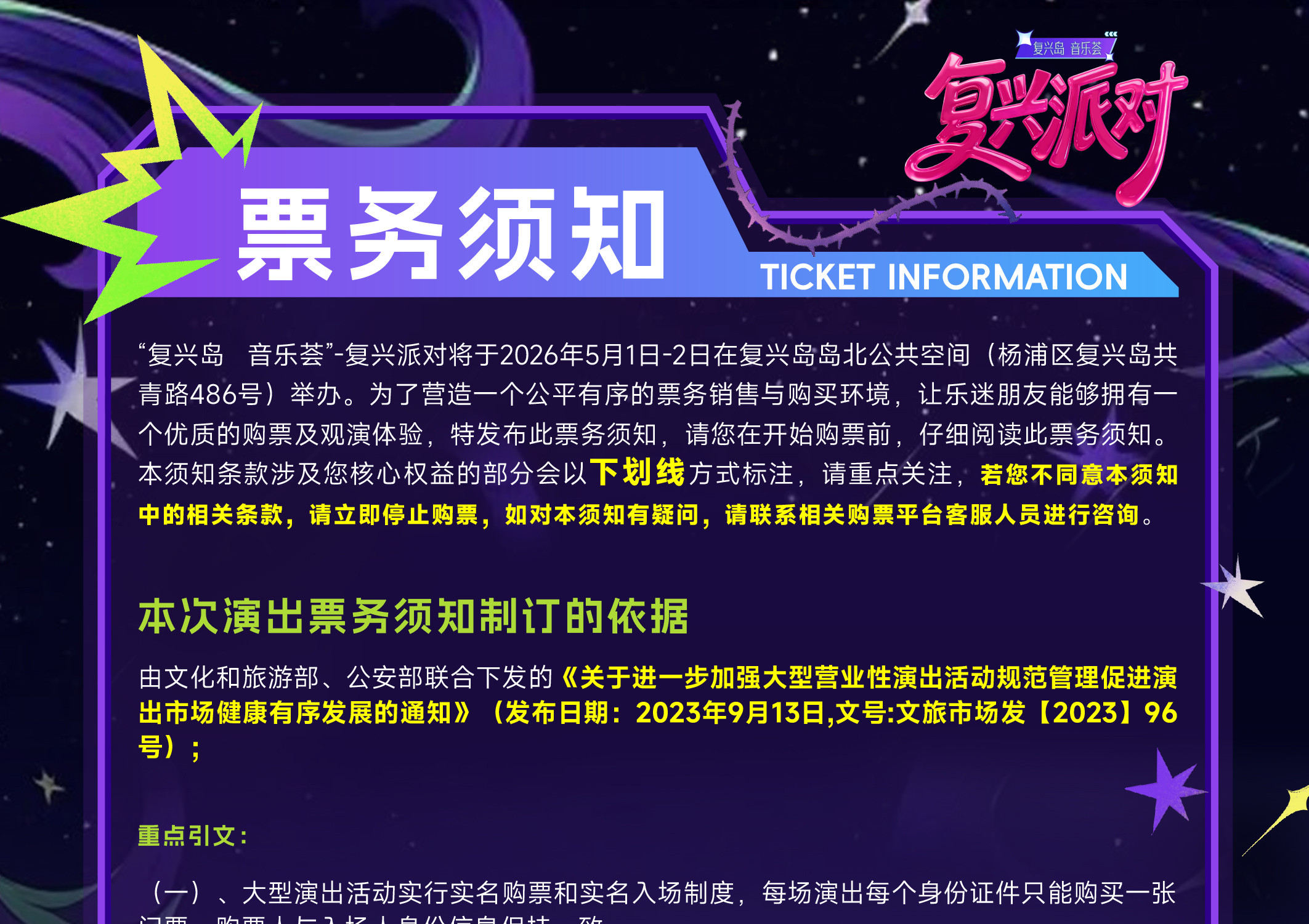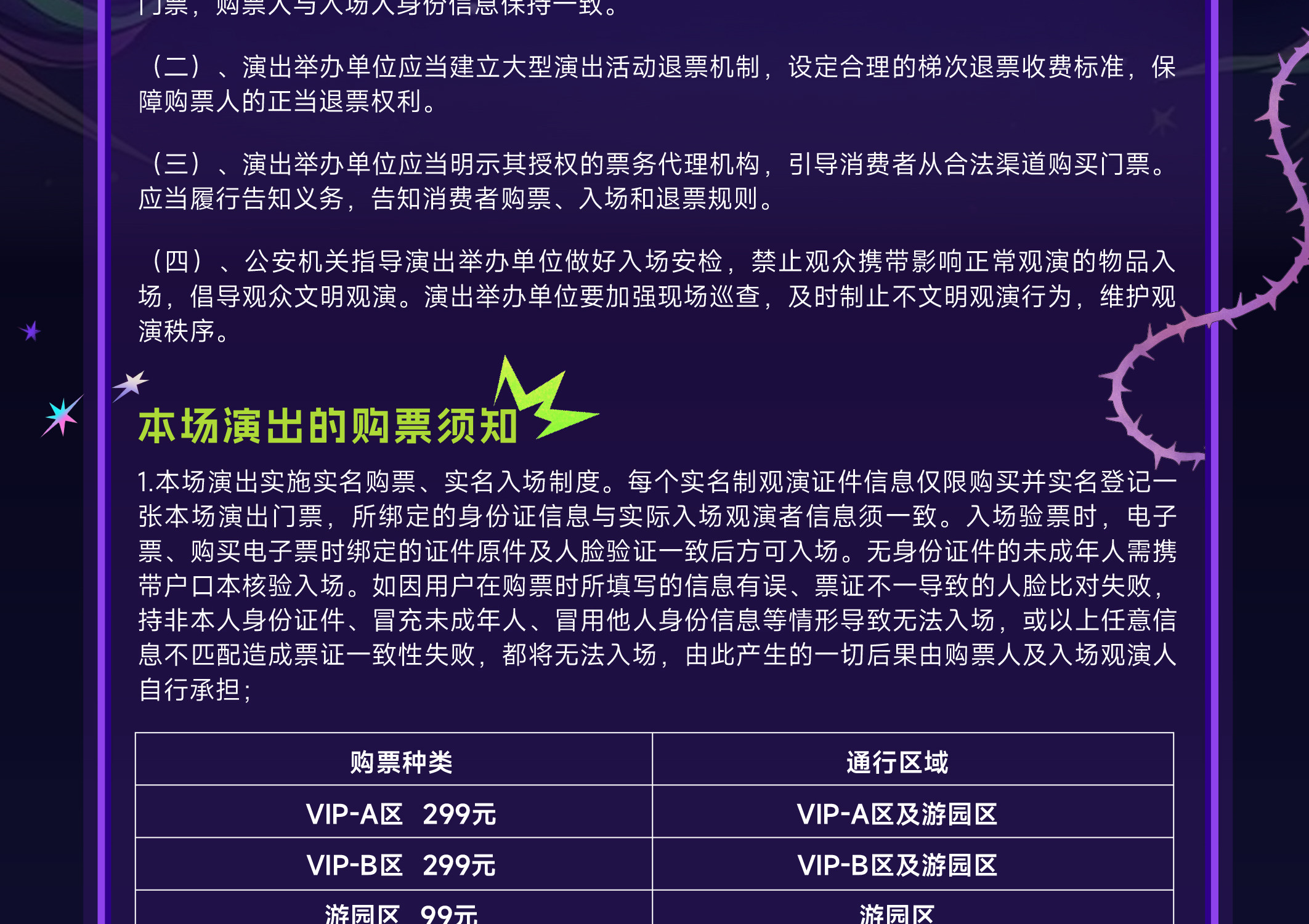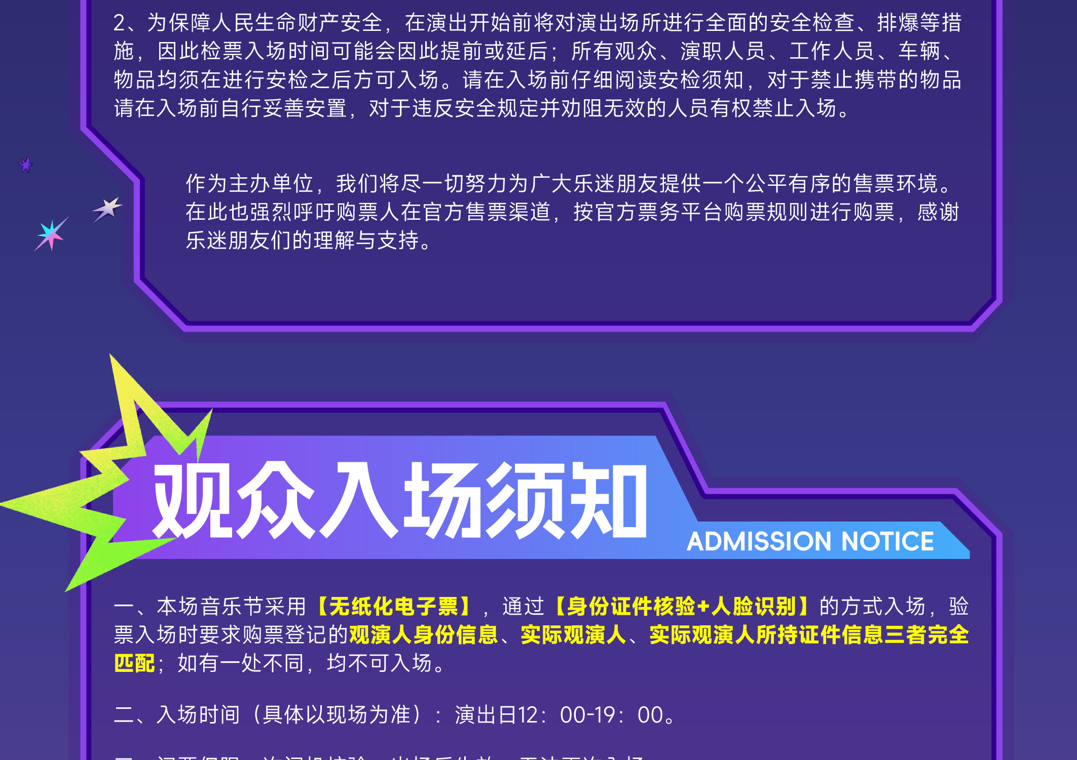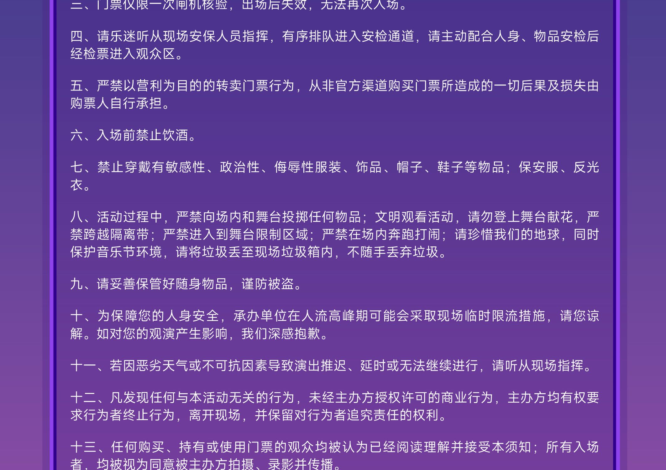 1.演出票品为特殊商品,除不可抗力因素导致演出取消外,订单不支持退换,可在平台转售; 2.演出详情仅供参考,具体以主办方公布信息及现场为准,请准时到场以免错过演出; 3.有票官方确保售出票品真实有效,请放心购买; 4.根据演出火爆情况,有票平台可能会将您所选的快递送票、上门自取等取票方式调整为现场取票,敬请谅解; 5.平台会尽力促使卖家履行交易协议,如果卖家付票过程中发生问题,本平台可协调相同或更高票挡的票品代替,否则平台将全额退款并按订单上约定的赔付方式与金额向用户进行赔付; 6.为了安全起见需要本人签收,演出快递票均为快递费到付(不包邮),请知晓!