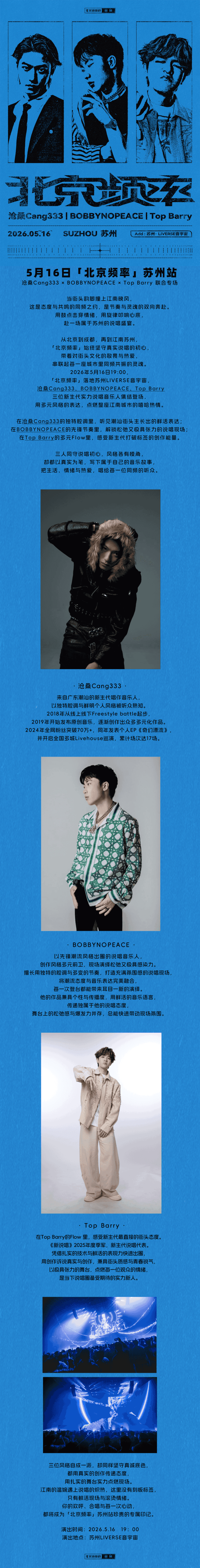 首页 > 演唱会 > 沧桑Cang333 & BOBBYNOPEACE & Top Barry联合专场【北京频率】— 苏州站