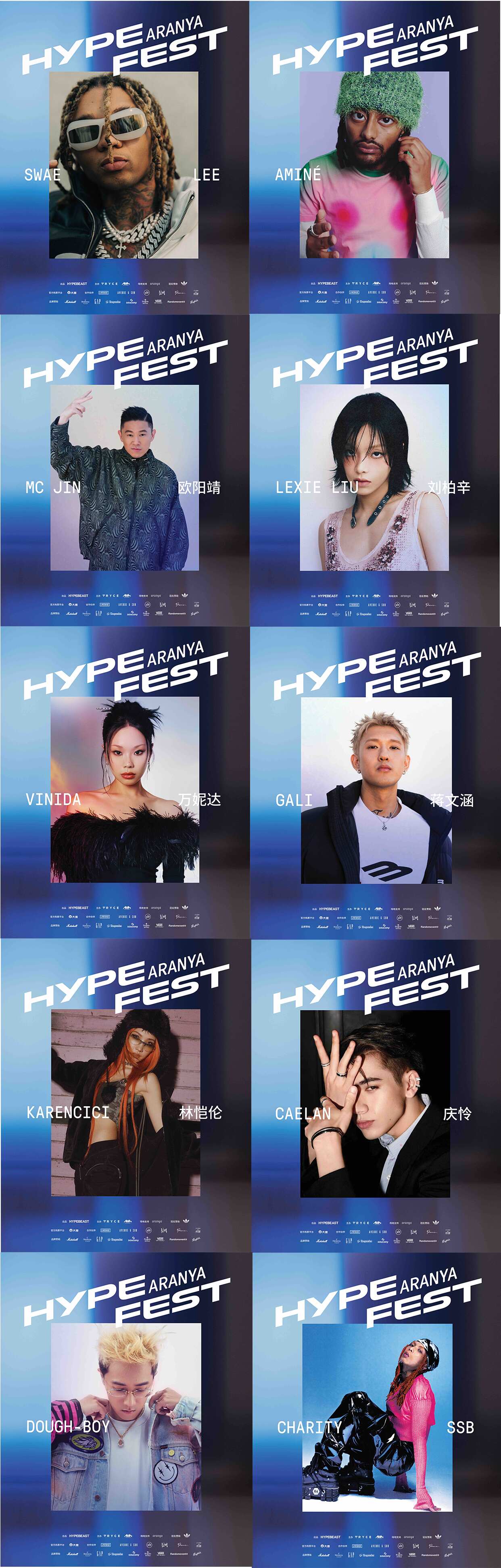 为带来不同风格的音乐享受,Hypefest Aranya 音乐节将集结来自世界各地的嘻哈、R&B 及流行音乐的歌手,首轮公布的强大演出阵容包括 Swae Lee、Aminé、MC Jin 欧阳靖、Lexie 刘柏辛、Vinida 万妮达、GALI 蒋文涵、Karencici 林恺伦、Caelan 庆怜、Dough-Boy 和 Charity SsB 等等,更多国际艺人将陆续揭晓,敬请期待!