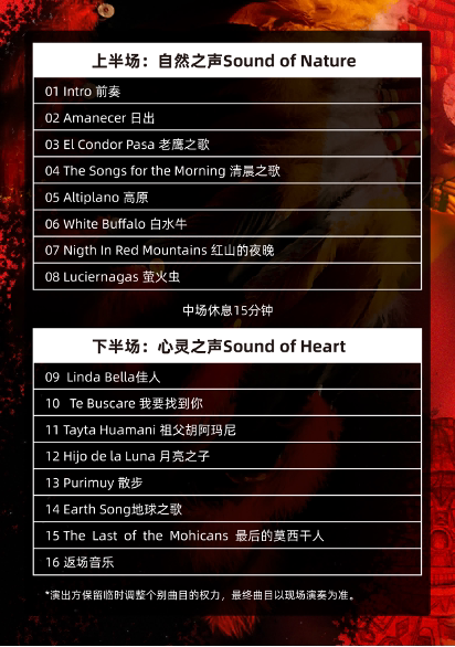印第安特色的笛箫类吹奏乐器(盖纳笛、安塔拉等)伴以纯天然材质的摇荡器,原住民之吟唱演绎出的印第安传统曲目,或大气磅礴,或哀婉淳朴,或欢快跳跃,轻而易举直入心底,与带有鲜明民族特色的印第安服饰,交织成一幅令人难忘的画面。